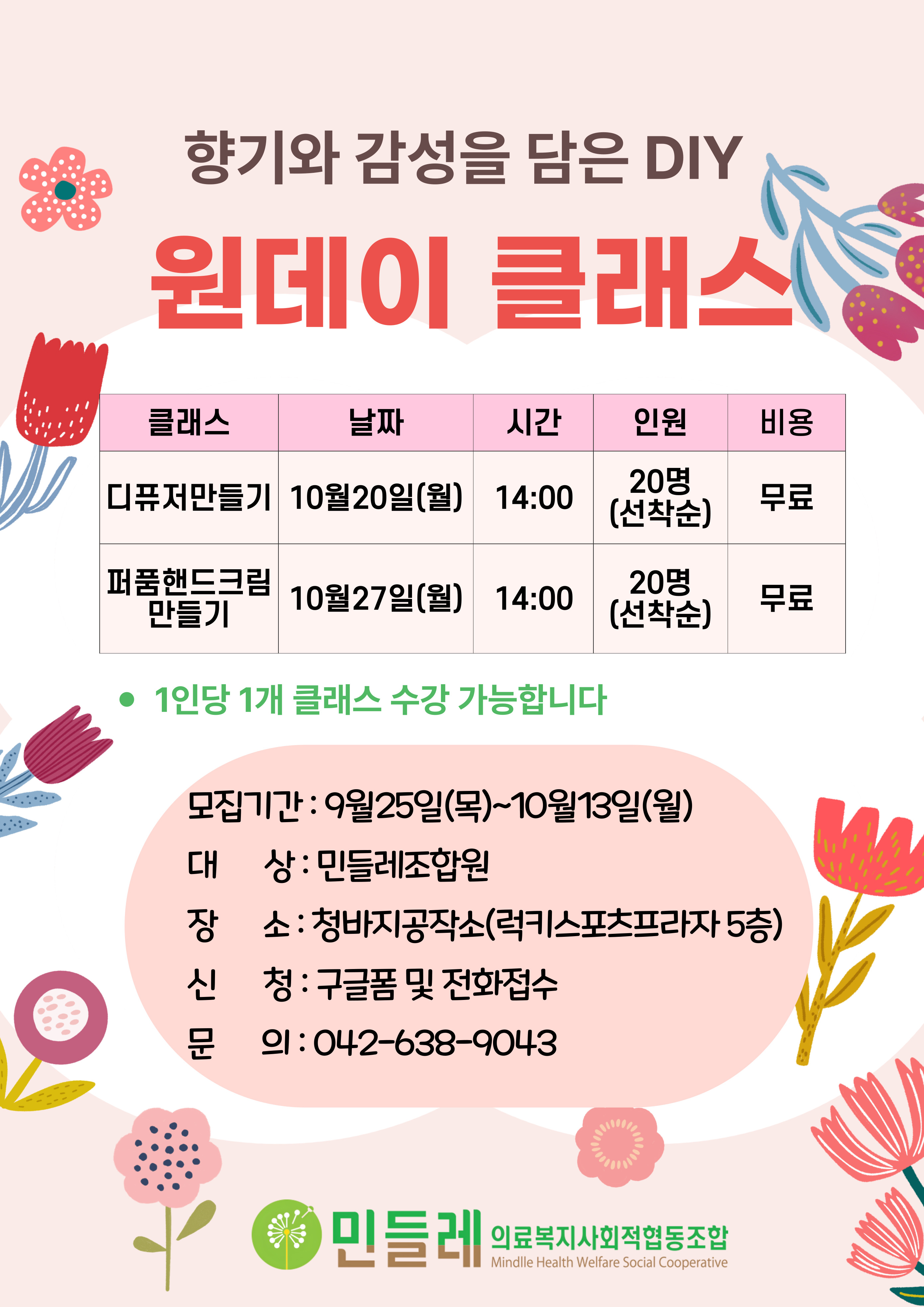 민들레조합원이면 누구나 신청 가능합니다 (1인당 1개 클래스만 신청 가능합니다)